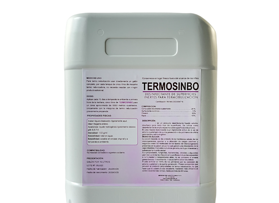 TERMOSINBO es un desinfectante líquido soluble, diseñado para todo tipo de superficies, incluso industriales.
